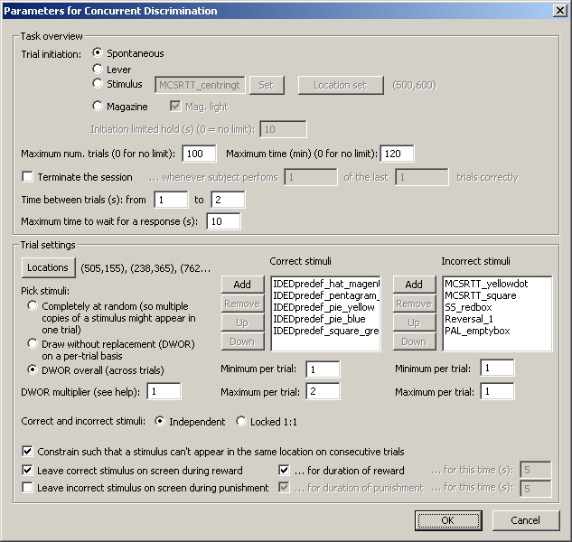 By default the task considers a separate set of correct and incorrect stimuli; however, you can also lock the correct stimulus list and the incorrect stimulus list together, creating a n-pair concurrent discrimination task (in which paired stimuli always appear together).